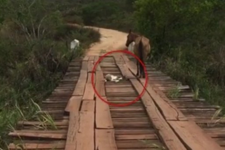 На видео видно, как маленькая лошадка застряла посреди старого деревянного моста, а ее мать – взрослая лошадь стоит рядом и не может ничем помочь.