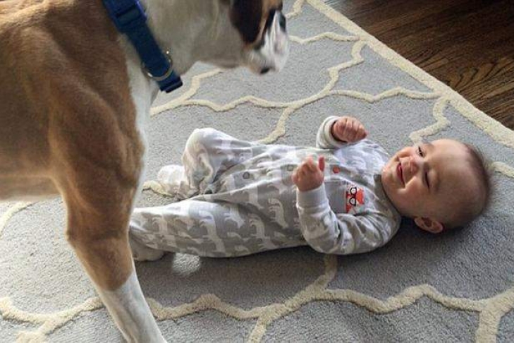 Мама ребенка - Кэти - знает, как успокоить своего малыша, когда тот собирается заплакать. Она призывает семейного пса Дживеса, который начинает прижимать свою мордочку к животу расстроенного младенца.