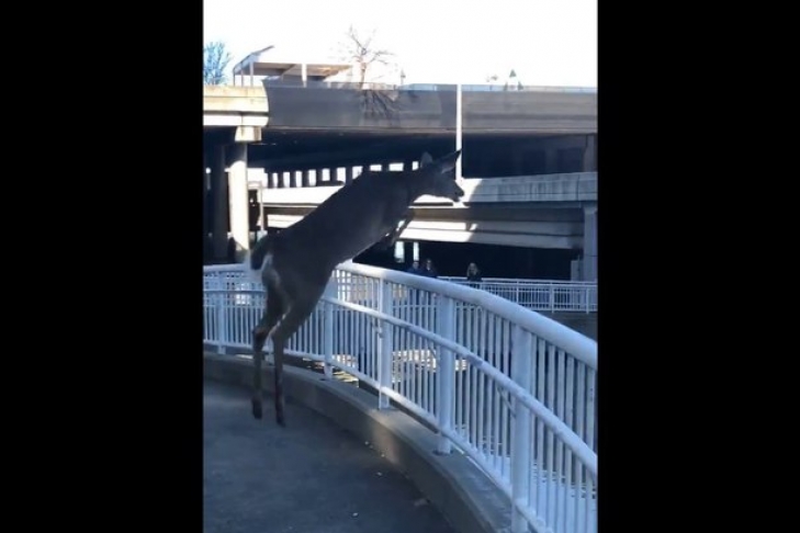 Любопытный случай произошел днем в минувший понедельник, 26 февраля, около отеля Galt House в Луисвилле. Прыжку, как уточняет Courier Journal, предшествовал забег по Западному Бродвею, в ходе которого напуганный олень перемахнул через пикап на дороге.