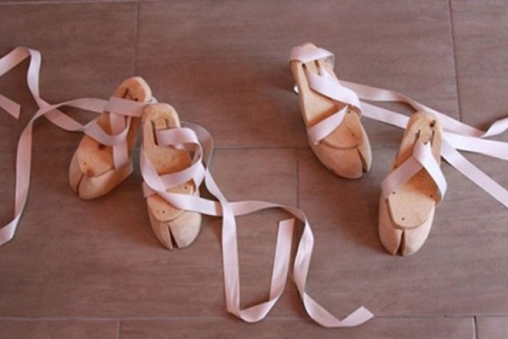 Сандалии выполнены большей частью из дерева. При этом нога закрепляется в них лентами, которые завязываются на щиколотке.