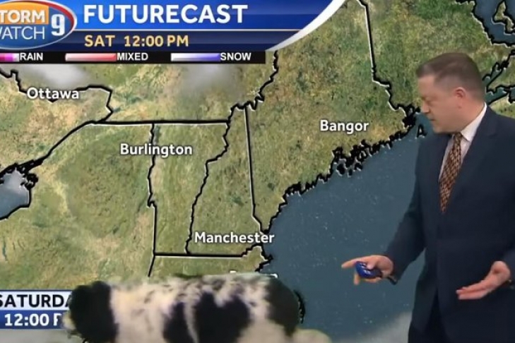 Большая черно-белая собака внесла смятение в выпуск прогноза погоды на телеканале WMUR-TV в США.