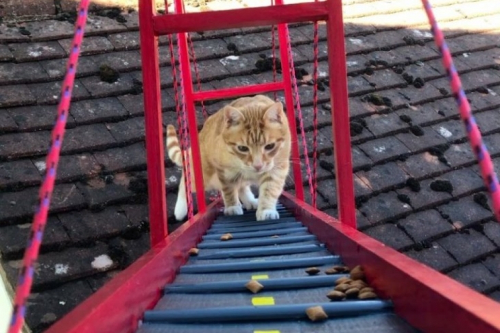 Чтобы стимулировать кота, парень разложил на мосту разные вкусняшки и это сработало. Кот начал ходить по мосту, а то и просто лежать на нем и обозревать с высоты окрестности.