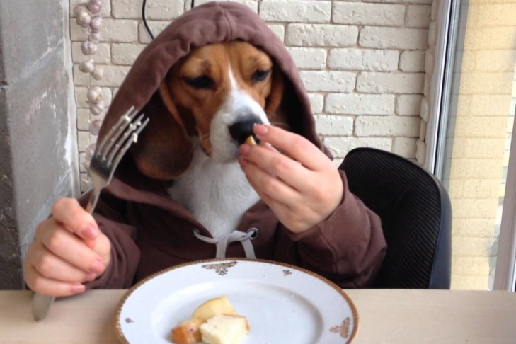 В Сеть попало видео выступления, где пес ест за столом, используя вилку и нож.