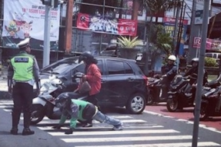 Водитель в зеленой куртке, как видно, отжимается прямо на пешеходном переходе, пока за ним стоят другие байкеры, а сотрудник службы безопасности Бали наблюдает и не замечает нарушителя на автомобиле.