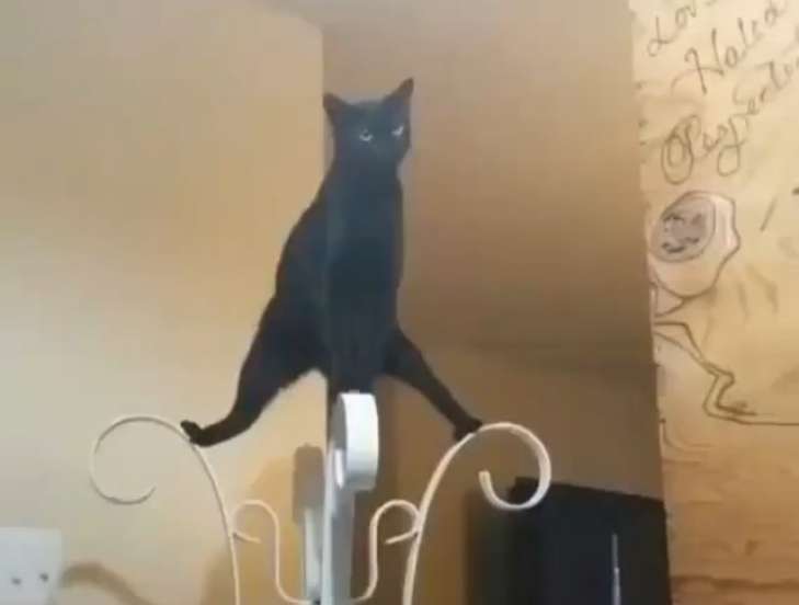 В ролике засняли черного кота, который сел на шпагат на вешалке. Пушистый оказался настолько пластичным, что неудобная поза, судя по всему, не мешает ему.