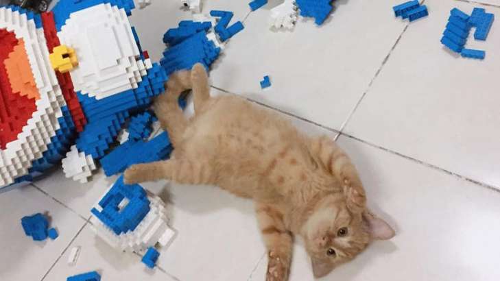 Владелец животного работает в магазине игрушек в Бангкоке и в течение недели собирал фигуру персонажа японской манги для одного из клиентов, но кот испортил его труд.