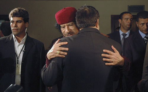 Каддафи обнимает президента Туниса Зин аль-Абидин Бен Али во время мини-саммита арабских стран в Триполи 10 июня 2008 года. По данным Государственного департамента США полученным от WikiLeaks, Каддафи боится летать и путешествует в компании «пышной блондинки» – украинской медсестры.
