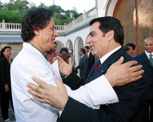 Президент Туниса Зин эль-Абидин Бен Али приветствует Каддафи в Тунисе 2 августа 2000 года.
