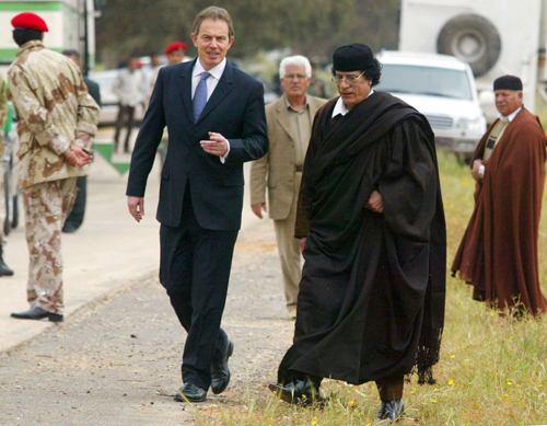 Премьер-министр Великобритании Тони Блэр (слева) во время прогулки с Каддафи рядом с шатром Каддафи в Триполи 25 марта 2004 года.