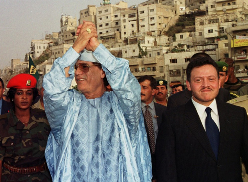 Король Иордании Абдалла II (справа) сопровождает Каддафи в мэрию Аммана, где состоялась церемония в честь Каддафи 5 октября 2000 года. Каддафи известен тем, что его обычно охраняли женщины-телохранительницы (на заднем плане, слева).