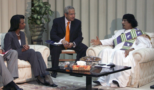 Каддафи на встрече с государственным секретарем США Кондолизой Райс в Триполи 5 сентября 2008 года.