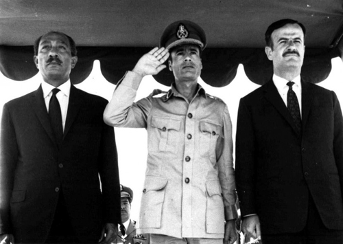 Египетский президент Анвар Садат (слева), президент Ливии полковник Муаммар Каддафи (в центре) и сирийский генерал Хафез Асад во время приема в Дамаске в 1971 году. Снимок сделан 18 августа 1971 года (AP).