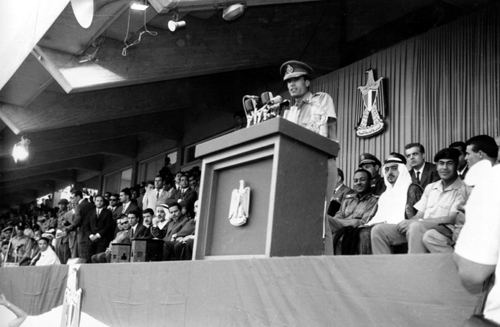 Полковник Муаммар Каддафи, возглавляющий Совет революционного командования Ливии, обращается к толпе на стадионе Бенгази. Выступление посвящено выводу американских войск с территории Ливии. 25 июня 1970 года.