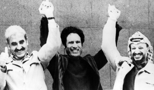 Председатель Организации освобождения Палестины Ясир Арафат (справа) с ливийским лидером Муаммаром Каддафи (в центре) и лидером ООП Джорджем Хабашем приветствуют делегатов на саммите арабских государств 4 декабря 1977 года.