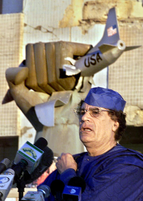 Каддафи на фоне статуи, изображающей схватившую американский военный самолет руку, рядом со своим домом в Триполи 5 февраля 2001 года. В 2009 году в обращении к Генеральной Ассамблее ООН Каддафи раскритиковал США за войну в Ираке, заявив, что бывший президент США Джордж Буш, должен быть осужден за военные преступления.