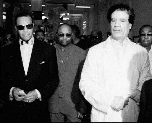 Каддафи с с лидером мусульман США Луисом Фарракханом (слева) на открытии новой больницы в Триполи 31 августа 1996 года.