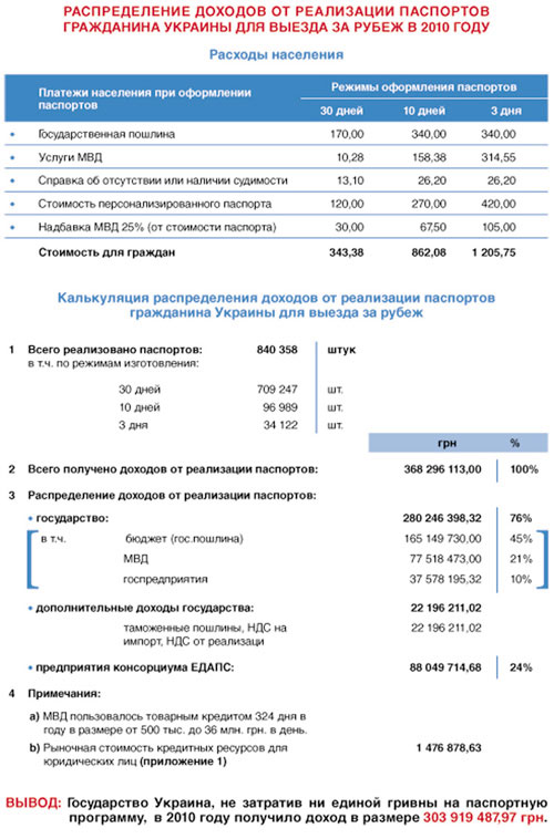 Ни одна зарубежная компания, по его словам, не согласилась бы работать на таких условиях. Такое положение вещей позволяет государству зарабатывать на оформлении загранпаспортов существенные средства – так, за 2010-й год эта сумма составила 303 миллиона гривен (см. фото ниже – распределение суммы, которую платят украинцы за оформление загранпаспорта).