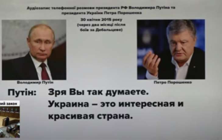 В четверг, 9 июля, народный депутат Андрей Деркач обнародовал запись телефонного разговора людей с голосами похожими на экс-президента Украины Петра Порошенко и глава Российской Федерации Владимира Путина, сделанная якобы 30 апреля 2015 года (через 2 месяца после трагедии в Дебальцево), передает NW.