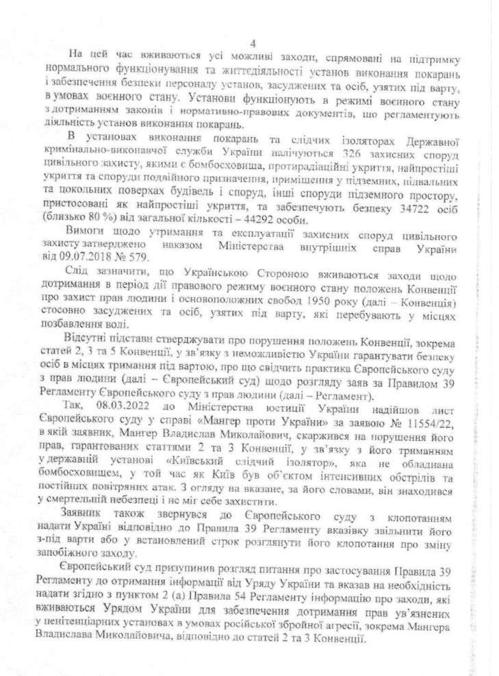 «Українські органи державної влади продовжують діяти на підставі в межах повноважень та у спосіб, передбачених Конституцією та законами України, вживаючи заходів для гарантування безпеки осіб, які перебувають на території держави. Зокрема, йдеться про забезпечення належного функціонування слідчих ізоляторів, установ виконання покарання, а також створення безпечних умов як для персоналу, так і засуджених і осіб, узятих під варту. В умовах воєнного стану в органах та установах виконання покарань, слідчих ізоляторах забезпечується дотримання конституційних прав та свобод людини і громадянина, а гарантування безпеки засуджених та ув’язнених залишається одним із пріоритетів діяльності і перебуває на особливому контролі Міністерства юстиції України», - йдеться у листі міністра юстиції України до Альми Задіч.