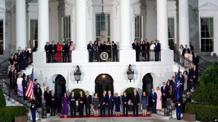 Фото: Президент Джо Байден и первая леди Джилл Байден приветствуют союзников по НАТО и партнеров альянса в Белом доме. Вашингтон, 10 июля 2024 года.