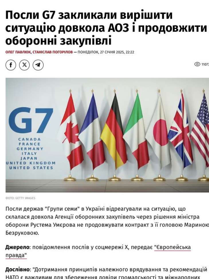 • Українська правда акцентує увагу на “критиці Умєрова з боку G7”, хоча цього прямо немає у заяві.