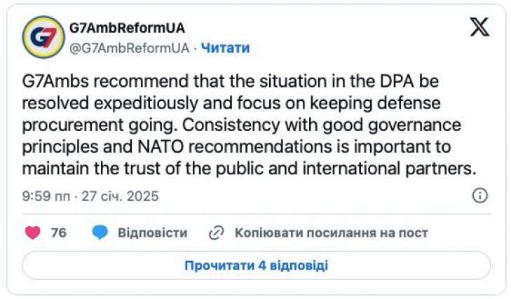 “G7Ambs recommend that the situation in the DPA be resolved expeditiously and focus on keeping defense procurement going. Consistency with good governance principles and NATO recommendations is important to maintain the trust of the public and international partners.”