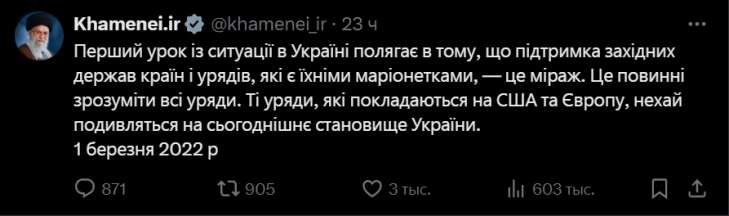 Верховний лідер Ірану аятола Алі Хаменеї опублікував у соцмережі X пост українською мовою. Він написав, що не можна покладатися на підтримку країн Заходу.