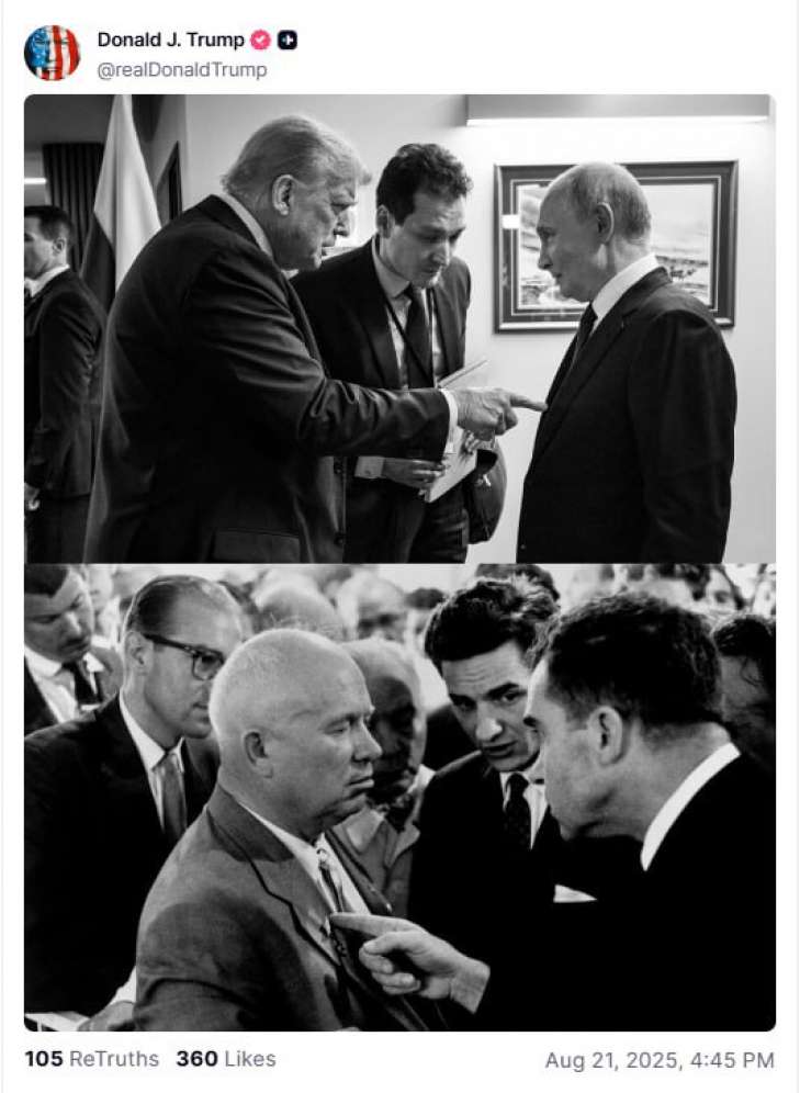 Після посту з критикою попередника Трамп опублікував колаж із двох фото. Перше — з його зустрічі з російським лідером володимиром путіним на Алясці 15 серпня. А друге — знімок так званих кухонних дебатів між тодішнім віцепрезидентом США Річардом Ніксоном і першим секретарем Комуністичної партії СРСР Микитою Хрущовим у липні 1959 року.