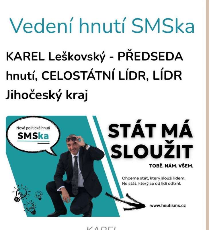 Скільки разів ми замислювалися: хто має кому служити? Часи, коли казали: «Не питай, що держава може зробити для тебе, запитай, що ти можеш зробити для держави», минули. Сьогодні держава належить людям. Держави створили люди, аби вони їм служили. Програмні тези нової політичної сили зрозумілі й несуть у собі принципову зміну. Навіть їхня абревіатура «SMS» може бути зрозуміла глобально: «State Must Serve» (Stát Má Sloužit - Держава Має Служити). Давайте й ми надихнемося цією поки ще невеликою, але концептуально й програмно дуже цікавою політичною партією «SMS».