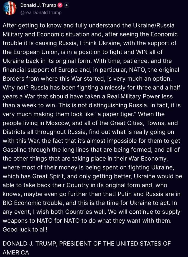 Американський президент пише, що він повністю ознайомився з ситуацією в економічній та оборонній сферах двох ворогуючих країн — України та Росії. Це дало йому розуміння, яких економічних труднощів зараз зазнає РФ через тривалу війну, що не принесла їй очевидного успіху на полі бою. Виходячи з цього, Дональд Трамп вважає, що Україна може використовувати економічний занепад Росії, щоб деокупувати всі свої території.