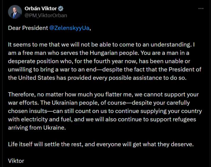 У відповідь Віктор Орбан заявив, що Україна та Угорщина не зможуть дійти згоди. За його словами, він є "вільною людиною", яка служить угорському народові. Також угорський прем’єр звинуватив Зеленського в нездатності або небажанні завершити війну за чотири роки, попри значну підтримку з боку США, та наголосив, що Угорщина "не підтримуватиме воєнні зусилля України".