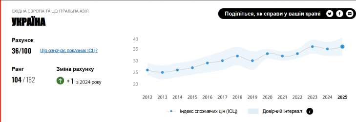 Transparency International 10 лютого опублікувала Індекс сприйняття корупції за 2025 рік. Україна посіла 104-те місце, набравши 36 балів зі 100. Таку ж позицію у рейтингу мають Аргентина та Беліз.