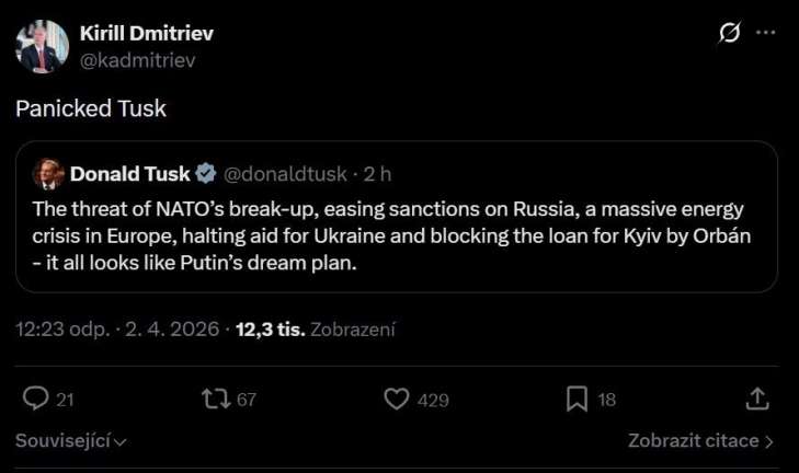 Повідомлення репостнув спецпредставник президента Росії Кирило Дмитрієв, назвавши Туска "панікером".