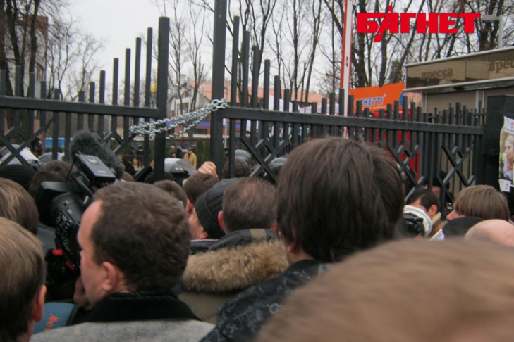 Возле ворот возникла потасовка: ранее спокойные сторонники Тимошенко начали ввязываться в конфликты с милицией, создали давку.