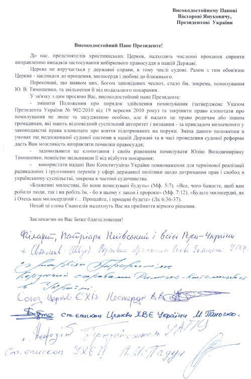 Это следует из обнародованного на сайте БЮТ текста письма, под которым подписались глава Украинской православной церкви Киевского патриархата Филарет, глава Греко-католической церкви Святослав Шевчук, управляющий делами Римско-католической церкви Маркиян Трофимьяк и другие представители христианских церквей.