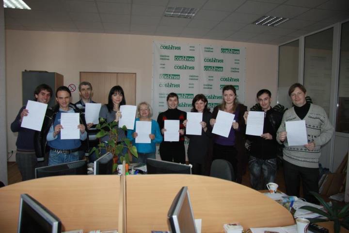 Весь творческий коллектив «Событий», в составе 12 человек (см. фото ниже ) написал заявление об увольнении и перестал работать. Газета не выходит, сайт издания закрыт.