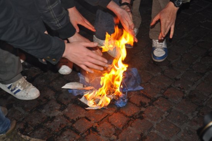В Черкассах патриоты украинского языка сожгли флаг Партии регионов (ФОТО)