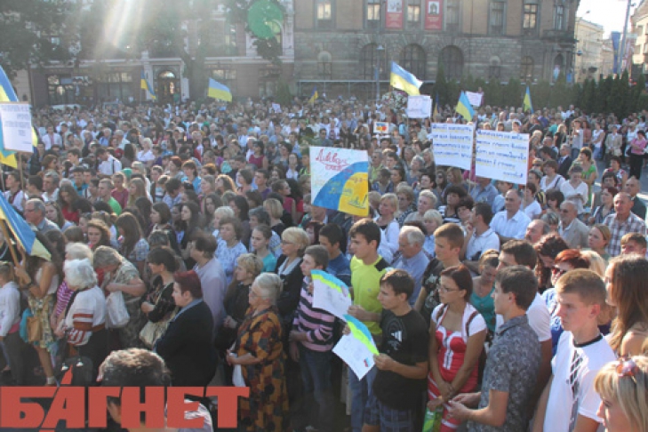 Во Львове состоялся митинг педагогических работников в поддержку украинского языка. Он прошел около памятника Тарасу Шевченко в центре города, на него собрались около трех тысяч человек. Собравшиеся были в вышиванках и держали государственные флаги. Участники митинга держали плакаты: «Только родной язык имеет лицо родной матери», «Защитим украинский язык», «Колесниченко и Кивалов, я буду разговаривать по-украински!».