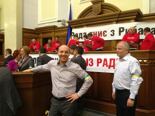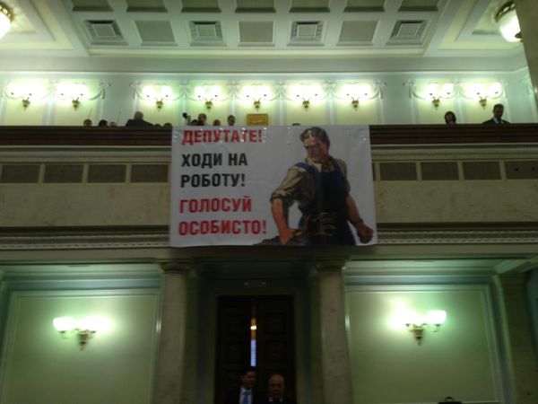 Торжественное открытие II сессии Верховной Рады VII созыва во вторник, 5 февраля, сорвано. По состоянию на 10 часов 30 минут сессионный зал остается заблокированным. Народные депутаты от оппозиции по-прежнему занимают президиум и усилили «посты» вокруг трибуны для выступлений, а также в ложе правительства. Сессионный зал украшен транспарантами и плакатами. Помимо транспаранта над президиумом «Рада гниет с Рыбака!», народные депутаты от оппозиции развесили на балконах плакат с изображением рабочего в синем комбинезоне в стилистике советского плаката и с надписью на украинском языке: «Депутат! Ходи на работу! Голосуй лично!», а также плакат в виде приоткрытых деревянных ворот, сквозь которые виден сессионный зал, из зала видна рука с вытянутым указательным пальцем и надписью «Кнопкодавам – нет!» Та же подпись на плакате с изображением оторванной гипсовой кисти руки, размещенном над ложей правительства. Некоторые депутаты от оппозиции ходят с повязками в цветах государственного флага Украины. Чтобы отличать своих», - отметил в неофициальной беседе один парламентарий. Также некоторые депутаты от УДАРа одеты в алые регланы с надписью-названием партии и фракции УДАР со спины и надписью «Голосуй лично!» с лицевой стороны реглана.