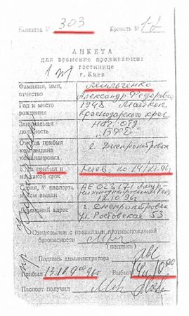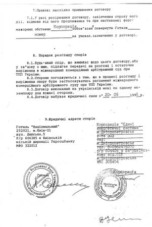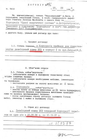 Из договора видно, что 20 сентября 1996 года между генеральным директором Единых энергетических систем Украины (ЕЭСУ) Юлией Тимошенко и генеральным директором отеля Леонидом Стригуном был заключен договор на аренду двухместного номера 303 сроком на один год. В ночь с 13 на 14 ноября этого же года в этом номере и поселился «Матрос» из банды Кушнира.