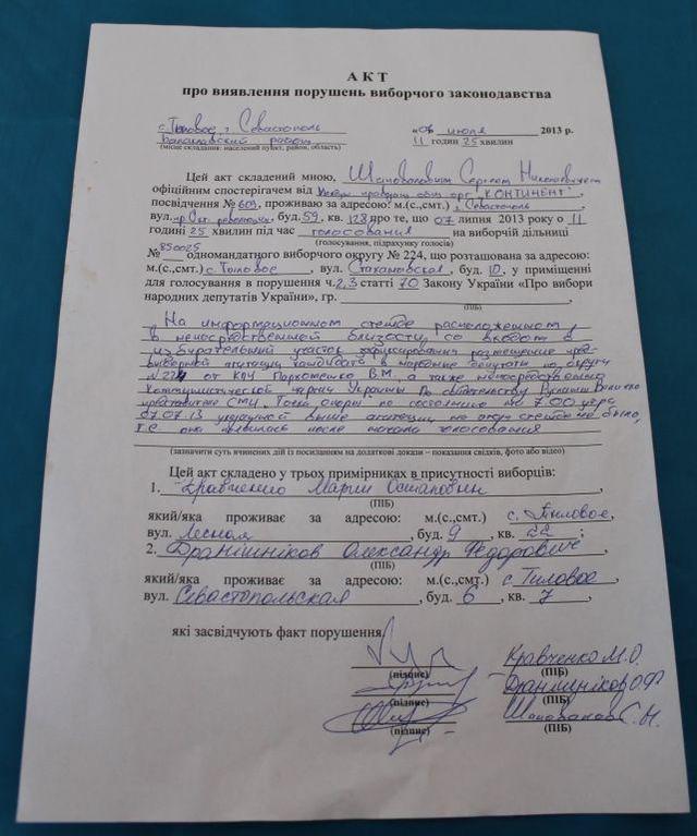 В Севастополе на участке № 850025 выявлено нарушение избирательного законодательства относительно размещения вблизи избирательного участка агитации за кандидата от КПУ Василия Пархоменко.