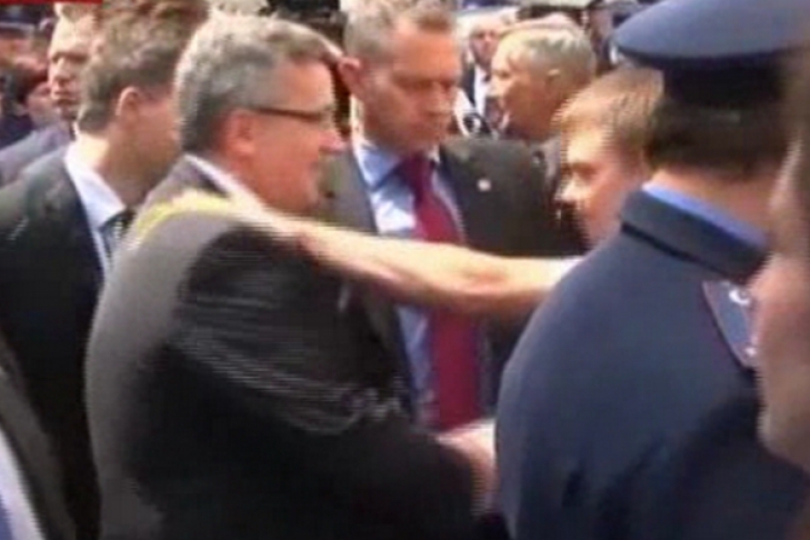 Когда Коморовский подошел пообщаться с верующими, которые ждали на площади, юноша из толпы похлопал его по плечу рукой, в которой было раздавленное яйцо.