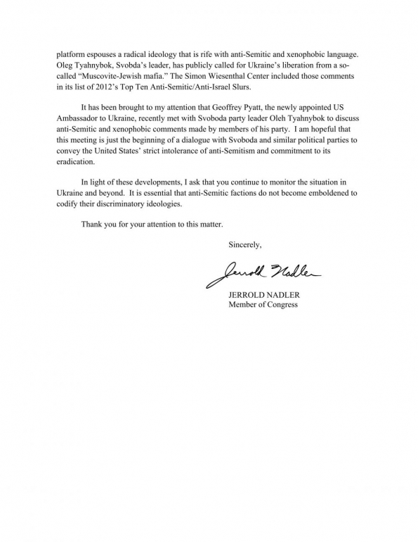Джеральд Надлер особо отметил, что недавно назначенный посол США в Украине Джефри Пайет специально встречался с Олегом Тягнибоком, чтобы заявить ему о недопустимости антисемитских и ксенофобских высказываний членов его партии. Встреча посла, считает сенатор, должна стать началом контактов с партией «Свобода» и другими украинскими организациями, для того, чтобы донести до них позицию: США будут жестко противодействовать националистической риторике политических партий.