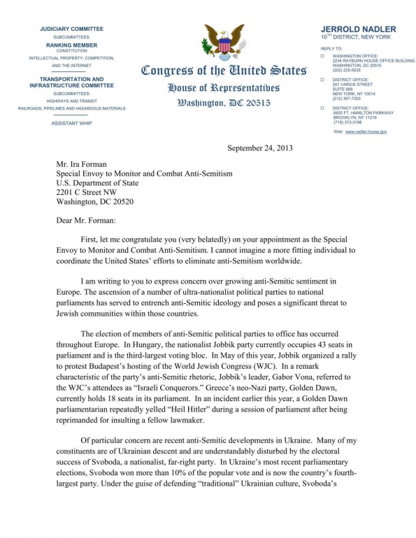 Американский конгрессмен Джеральд Надлер 24 сентября обратился с письмом к специальному представителю по мониторингу и борьбе с антисемитизмом Госдепартамента США Ири Форману, пишет Gazeta.ua. В письме (см. фото документа ниже) член палаты представителей Конгресса США с тревогой отмечает рост влияния крайне правых политических партий в Европе. Особое беспокойство конгрессмена вызвала победа на парламентских выборах ультра-правой националистической партии «Свобода».