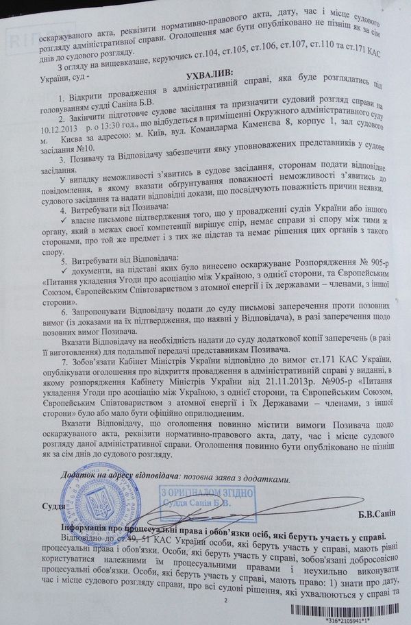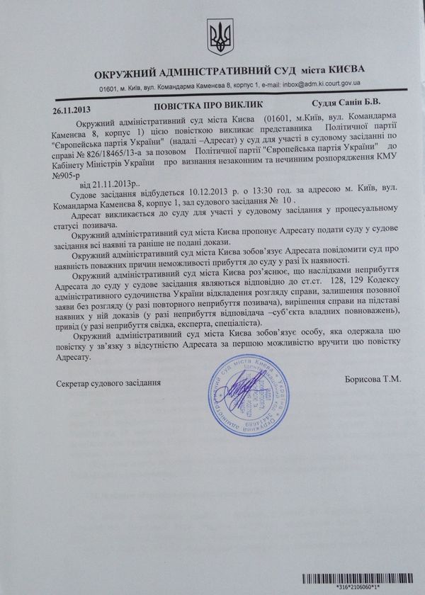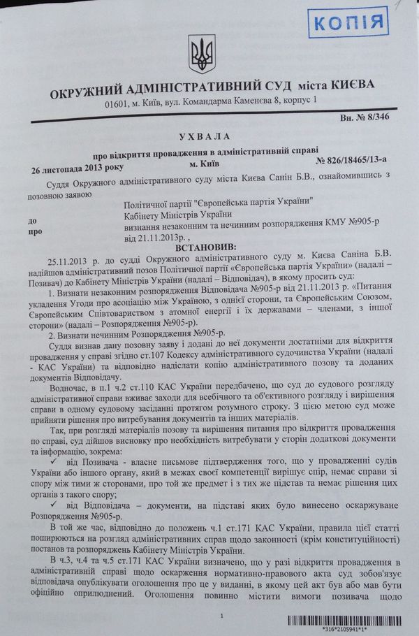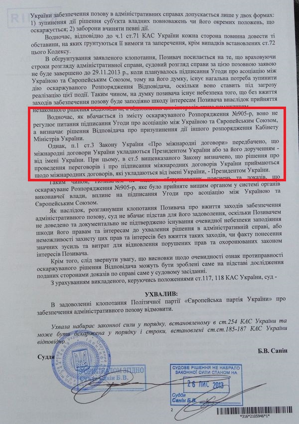 Он также сообщил, что Окружной административный суд своим постановлением отказал в обеспечении иска Европейской партии Украины и назначил предварительное слушание по делу на 10 декабря. «Суд фактически подтвердил незаконность распоряжения Кабинета Министров Украины от 21 ноября 2013 № 905-р «О заключении Соглашения об ассоциации между Украиной, с одной стороны, и Европейским Союзом, Европейским Сообществом по атомной энергии и их государствами-членами, с другой стороны», которым среди прочего предусмотрено «приостановить процесс подготовки к заключению Соглашения об ассоциации между Украиной и Европейским Союзом». И полученный нами документ является тому подтверждением», - добавил политик.