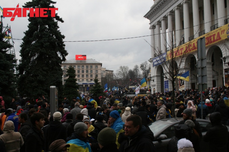 Как передает корреспондент «Багнета», по состоянию на 12.00 на Майдане Незалежности собралось около 5000 митингующих. Много флагов с названиями городов Киевской области. Милиции практически нет, все спокойно. На Майдане разбит палаточный городок, участники митинга сейчас принимают горячую пищу – чай, борщ. Слухи о том, что митингующие принимают спиртные напитки, не подтвердились. Никакого спиртного нет, как и нет пьяных. На импровизированной сцене выступают представители оппозиции. По словам администрации палаточного городка, сегодня будут разворачиваться новые палатки, ждут еще приезда людей из регионов.