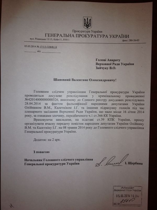 Как известно, главе Аппарата Верховной Рады пришло письмо из ГПУ, в котором речь идет о необходимости обеспечить передачу повестки И. Калетнику с требованием явиться в главное управление ГПУ по уголовному делу о подсчете голосов во время голосования 16 января.
