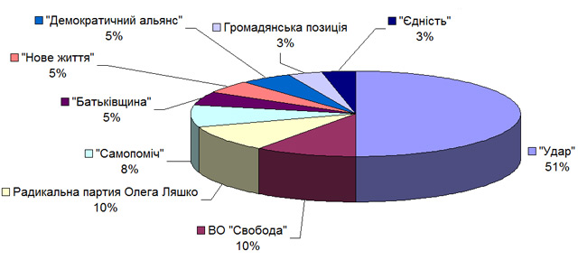 В пропорциональной части депутатского корпуса партия УДАР набрала, согласно опросов, 42,3% голосов жителей столицы и может рассчитывать на 30 депутатских мандатов из 60. Радикальная партия Олега Ляшко с 7,9% и ВО «Свобода» с 7,7% получат шесть мандатов.