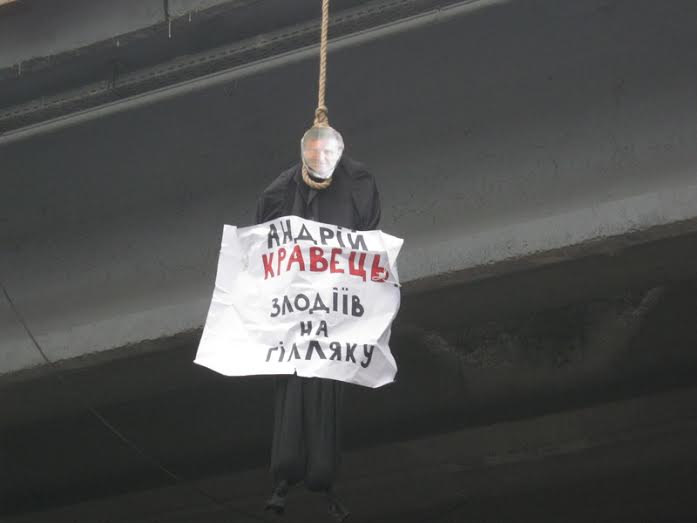 Как рассказали очевидцы, двое неизвестных мужчин достали манекены экс-чиновников и свесили их с моста. К «ногам» прикреплены плакаты: «Сергій Льовочкін і Андрій Кравець. Злодіїв на гілляку».