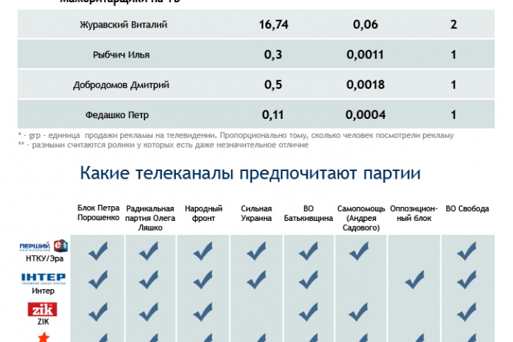 Беглый анализ телевизионных предпочтений идущих в Раду политиков позволяет понять, кто из медиамагнатов каким партиям симпатизирует. Например, Радикальная партия Ляшко активно рекламируется на каналах Интер и НТН, принадлежащих Фирташу-Левочкину, и совсем не размещается на каналах группы 1+1 медиа Игоря Коломойского. Нет рекламы на каналах Коломойского и ВО Батькивщина. Агитацию коммунистов можно увидеть исключительно на Интере и ТРК Украина Рината Ахметова. Реклама Оппозиционного блока кроме каналов Ахметова и Фирташа-Левочкина присутствует также на каналах Пинчука - СТБ и ICTV. А Самопомощь Андрея Садового не рекламируется на каналах Ахметова и Фирташа-Левочкина.